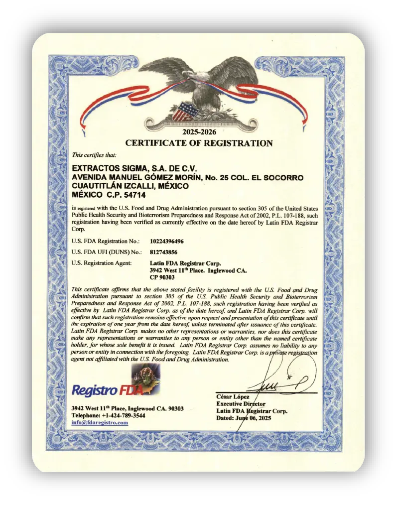 Con una infraestructura equipada con tecnología avanzada y equipos de calidad certificada, en Extractos Sigma aseguramos la pureza, consistencia y trazabilidad de cada lote de nuestros extractos. La innovación y la precisión son parte de nuestro compromiso con nuestros clientes.